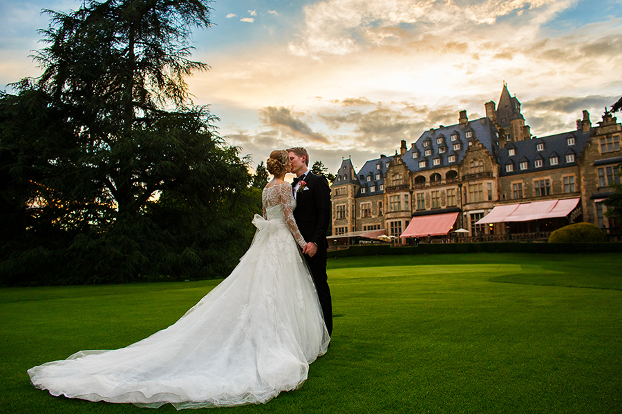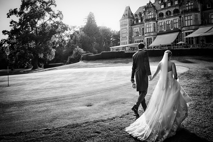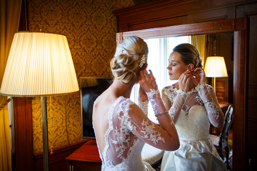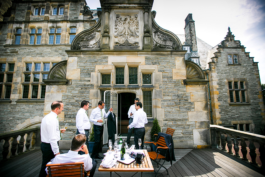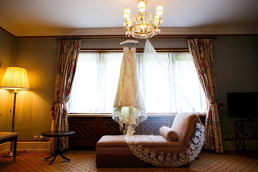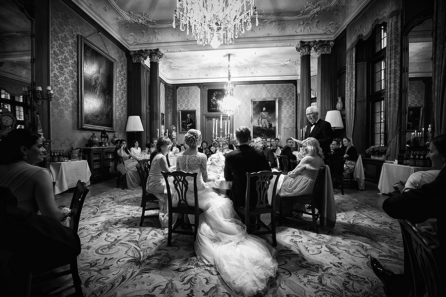 Besonders zu erwähnen ist nicht zuletzt die Vielfalt der Ausstattung. Denn jedes Zimmer oder jede Suite, die jeweils zum Getting Ready der Braut und des Bräutigams bezogen werden, sind aufgrund ihrer Individualität eine neue Entdeckung. Auch zu meinem Vorteil, denn diese Palette an exklusiven Kulissen ermöglicht mir als Fotograf das gleiche Geschehen immer wieder neu in Szene setzen zu können. Ebenso vielfältig sind die Optionen die Feierlichkeiten auszurichten. Beliebt für die Trauung im Innenbereich ist die beeindruckende Bibliothek der Kaiserin. Unter freiem Himmel ist die kaiserliche Grotte der perfekte Ort der Trauzeremonie, aber auch auf der großen Terrasse konnte ich schon tolle Trauungen fotografieren. Diese bietet außerdem eine entspannte Atmosphäre bei einem anschließenden Empfang.