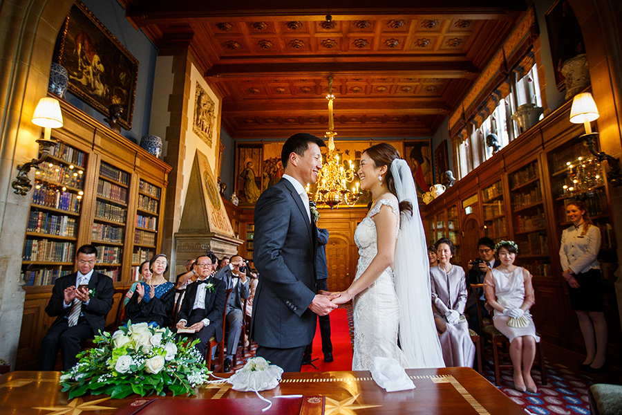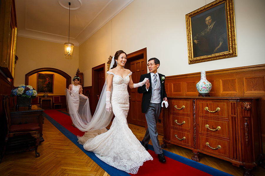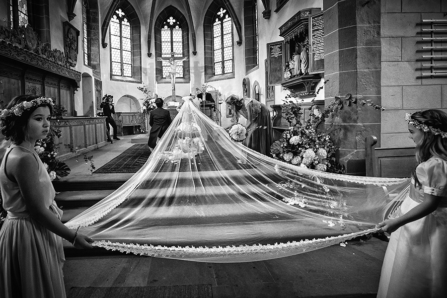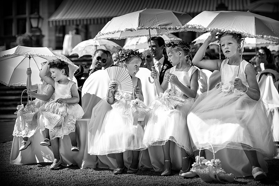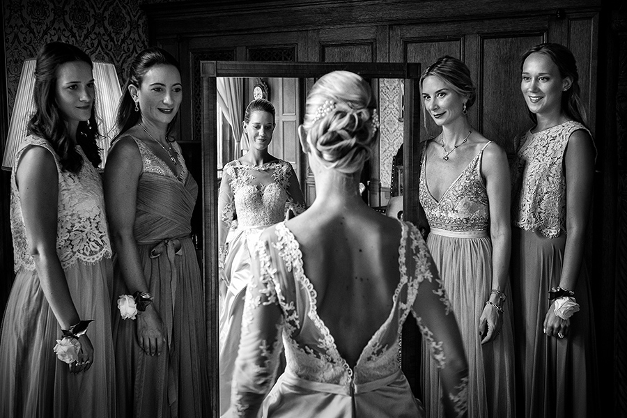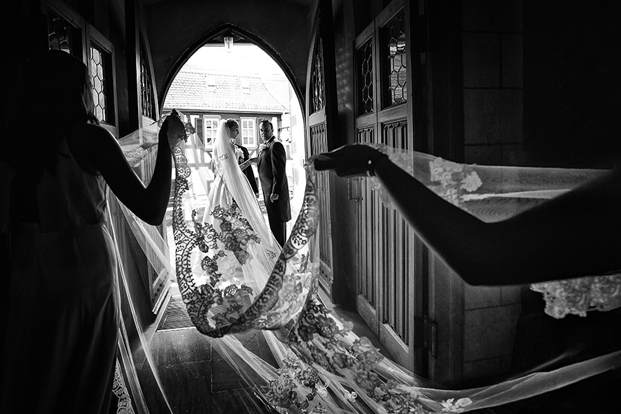 Besonders zu erwähnen ist nicht zuletzt die Vielfalt der Ausstattung. Denn jedes Zimmer oder jede Suite, die jeweils zum Getting Ready der Braut und des Bräutigams bezogen werden, sind aufgrund ihrer Individualität eine neue Entdeckung. Auch zu meinem Vorteil, denn diese Palette an exklusiven Kulissen ermöglicht mir als Fotograf das gleiche Geschehen immer wieder neu in Szene setzen zu können. Ebenso vielfältig sind die Optionen die Feierlichkeiten auszurichten. Beliebt für die Trauung im Innenbereich ist die beeindruckende Bibliothek der Kaiserin. Unter freiem Himmel ist die kaiserliche Grotte der perfekte Ort der Trauzeremonie, aber auch auf der großen Terrasse konnte ich schon tolle Trauungen fotografieren. Diese bietet außerdem eine entspannte Atmosphäre bei einem anschließenden Empfang.